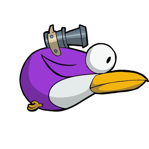 An action hero bird, holding a shooter with an angry bird kinda style