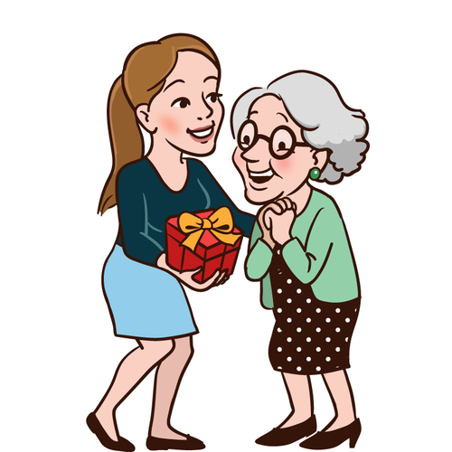 A smart and friendly young woman handing over a gift to her Grandmother, in the second illustration to her