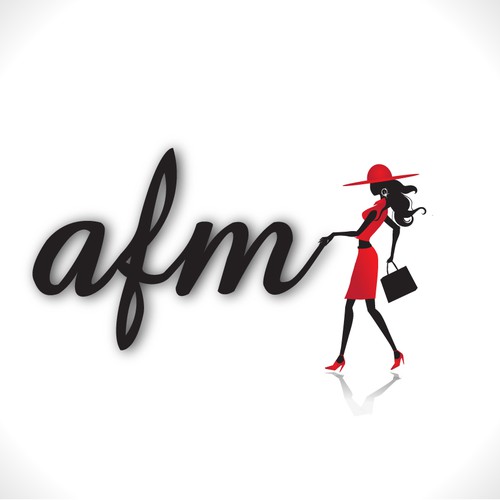 I want a logo that shows the silhouette of a female wearing a hat with her right hand on the letters afm.