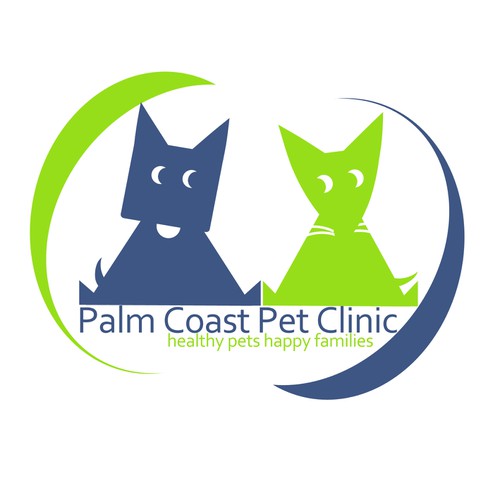 clean, professional, friendly logo featuring dog, cat, palm tree