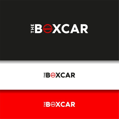 This is a food truck made out of a train boxcar . The boxcar is red. Serving hamburgers . I want it trendy . I want peop