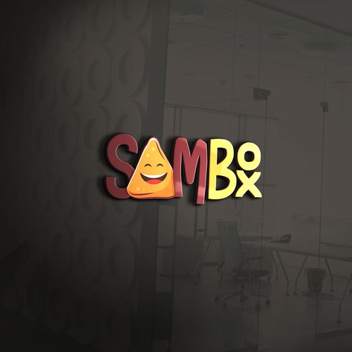 Restaurant name. Concept of Sambusa (triangle fried food) in a container store (box).