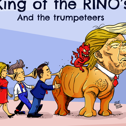 I am looking for a political statement.A caricature of Donald Trump as a rhinoceros.