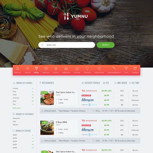 Yumnu is a site that lets people compare restaurants and food delivery options in their area See rough mockup for a ...