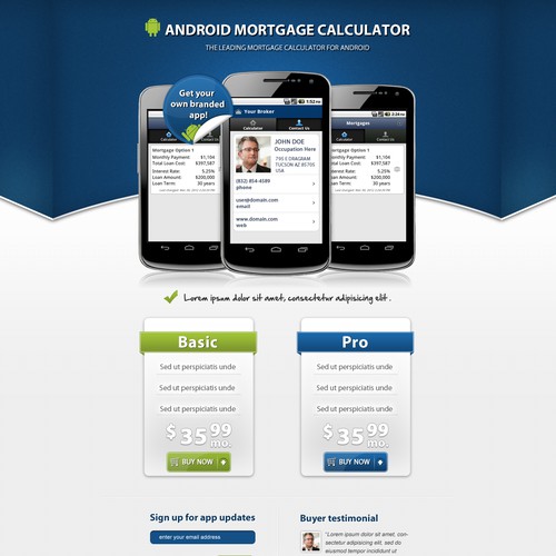 This will be a landing page to sell branded versions of our Android Mortgage Calculator App to Real Estate and Mortgage Brokers