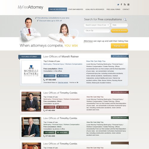 1) Free attorney matching service2) Offers Free consultations from attorneys in your area3) Discounted Rates up to 50% off re